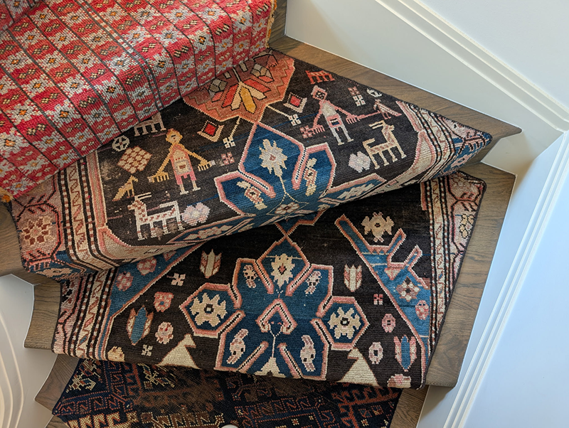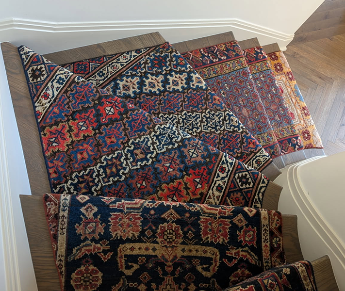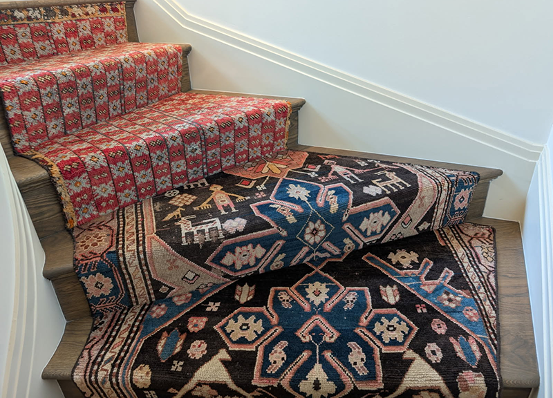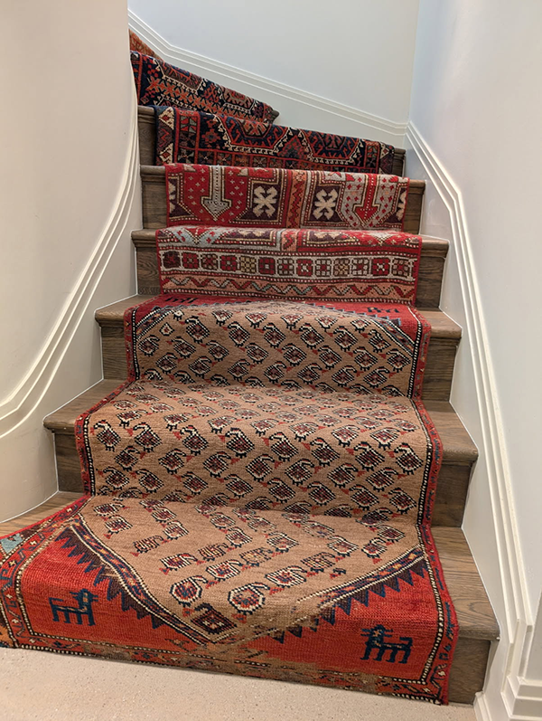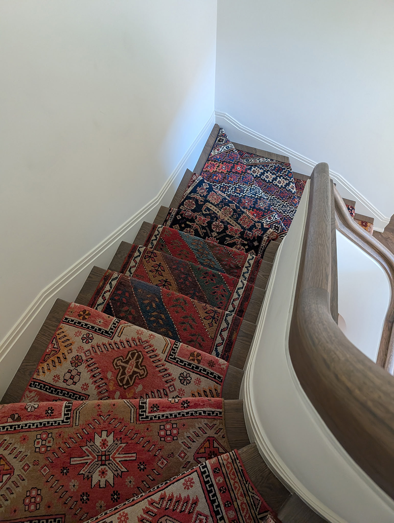This stair runner was fabricated from the cuttings of several oriental rugs. Templates were made of the stairs in order to provide a custom fit for each stair. Although the rugs look randomly set the client specified the location of each pattern.