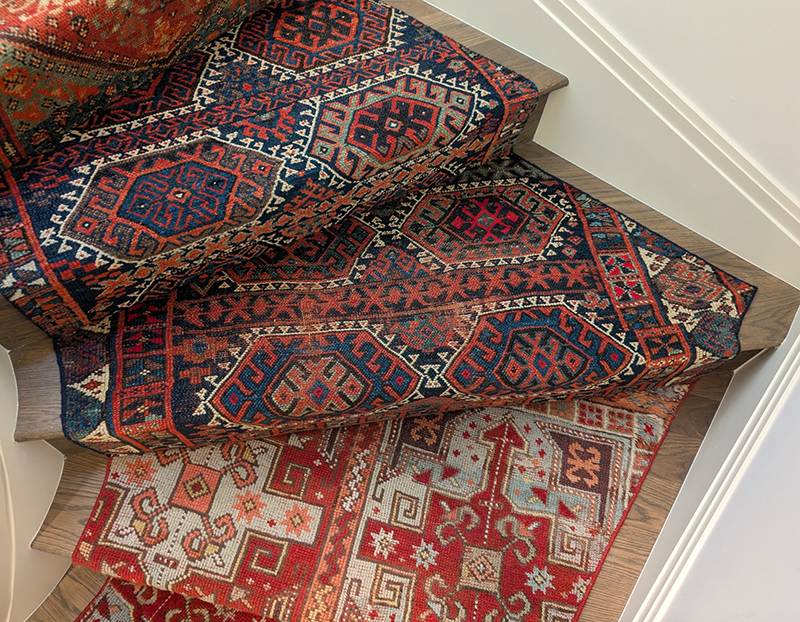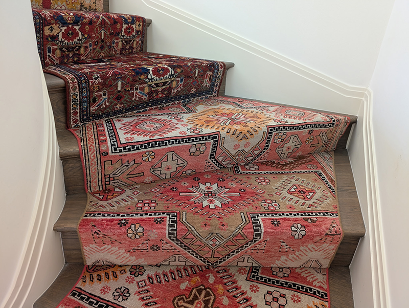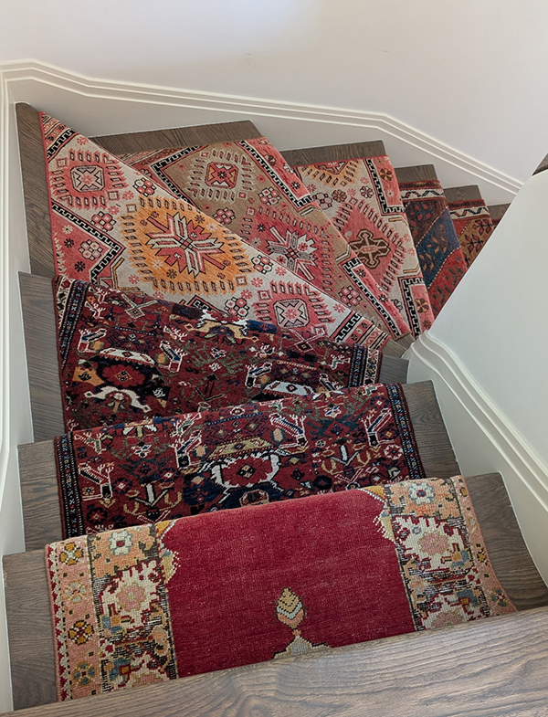 This stair runner was fabricated from the cuttings of several oriental rugs. Templates were made of the stairs in order to provide a custom fit for each stair. Although the rugs look randomly set the client specified the location of each pattern.